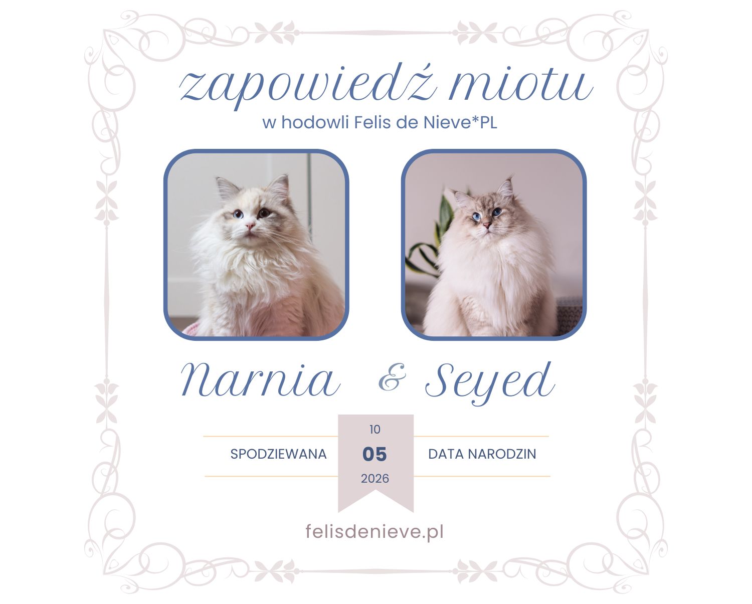 Narnia First Snow i Seyed Błękitny Anioł ponownie zostaną rodzicami kociąt Neva Masquerade. Będzie to miot na literkę “K”.